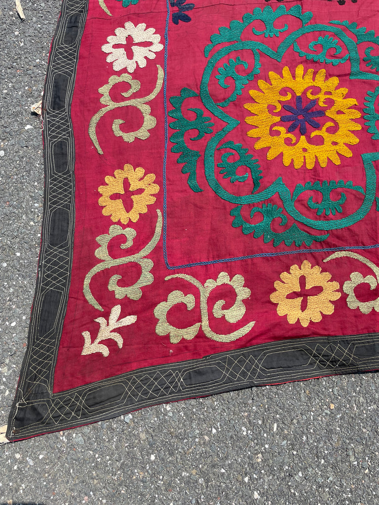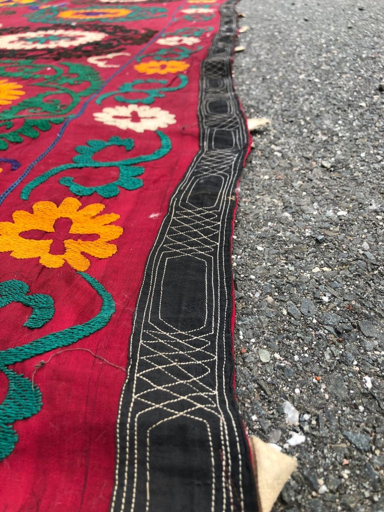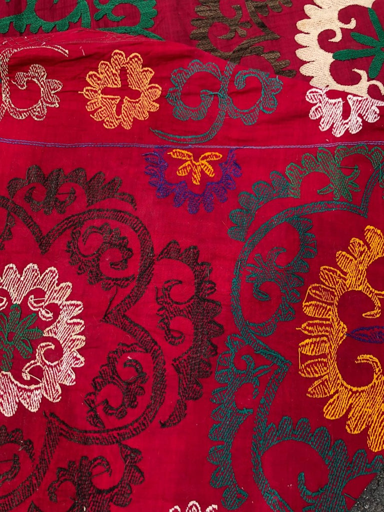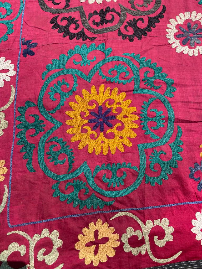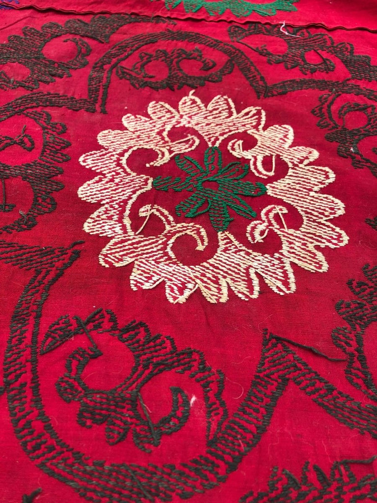 Old handmade uzbek wall hanging. This piece is a relic that was bought in Istanbul Turkey. Its an old handmade blanket or wall hanging and it contains a lot of history. Every stitch is done by hand.The piece shows beautiful imperfections of handmade stitches see the pictures.