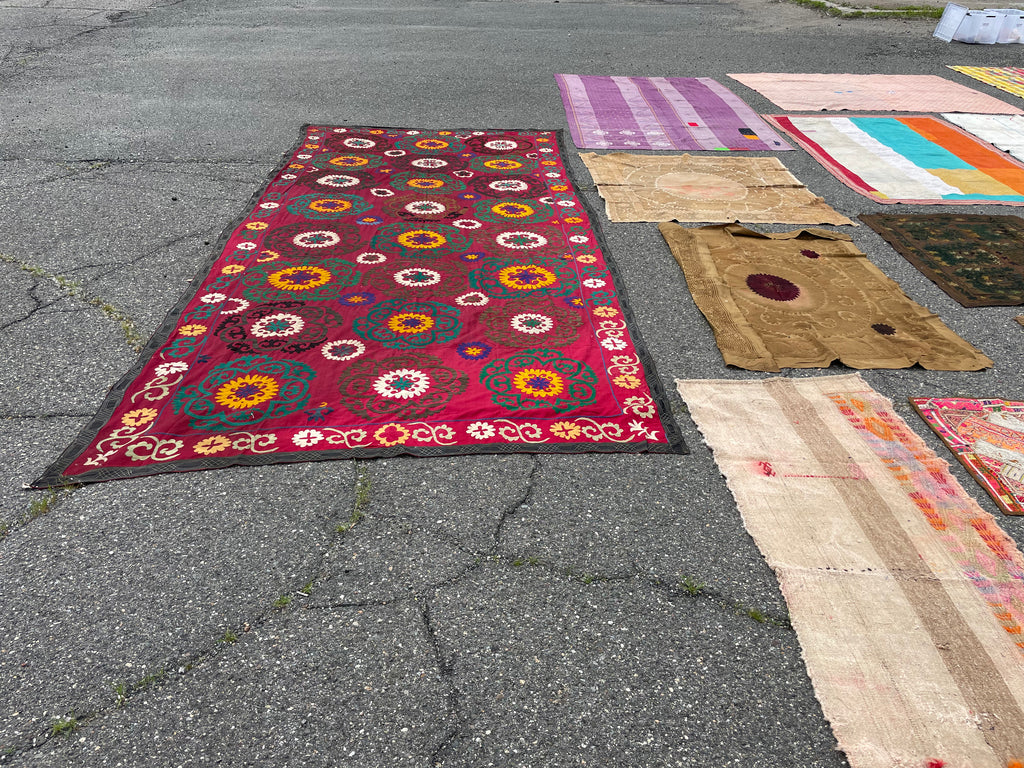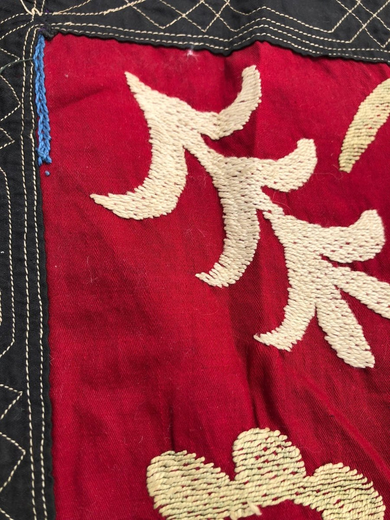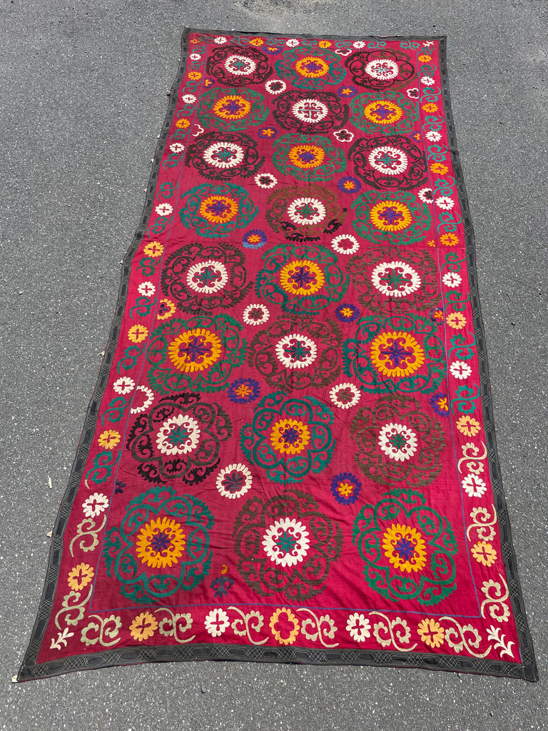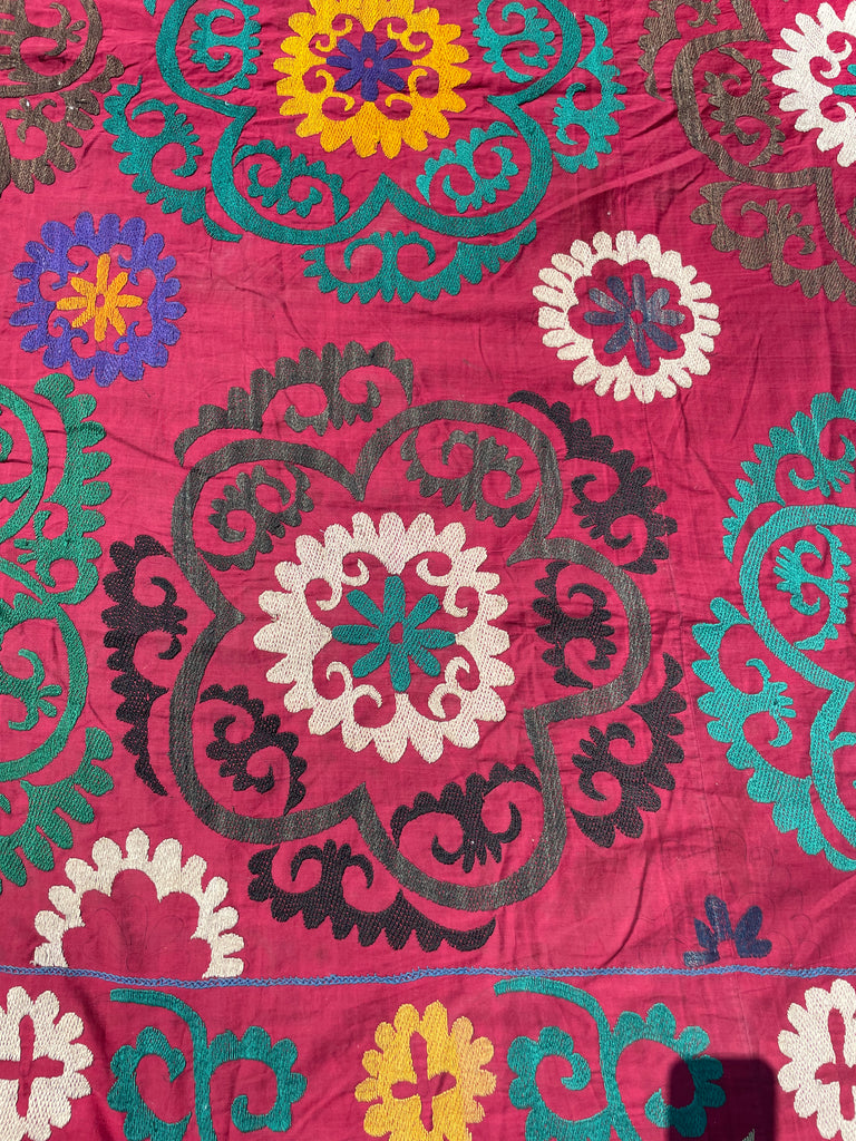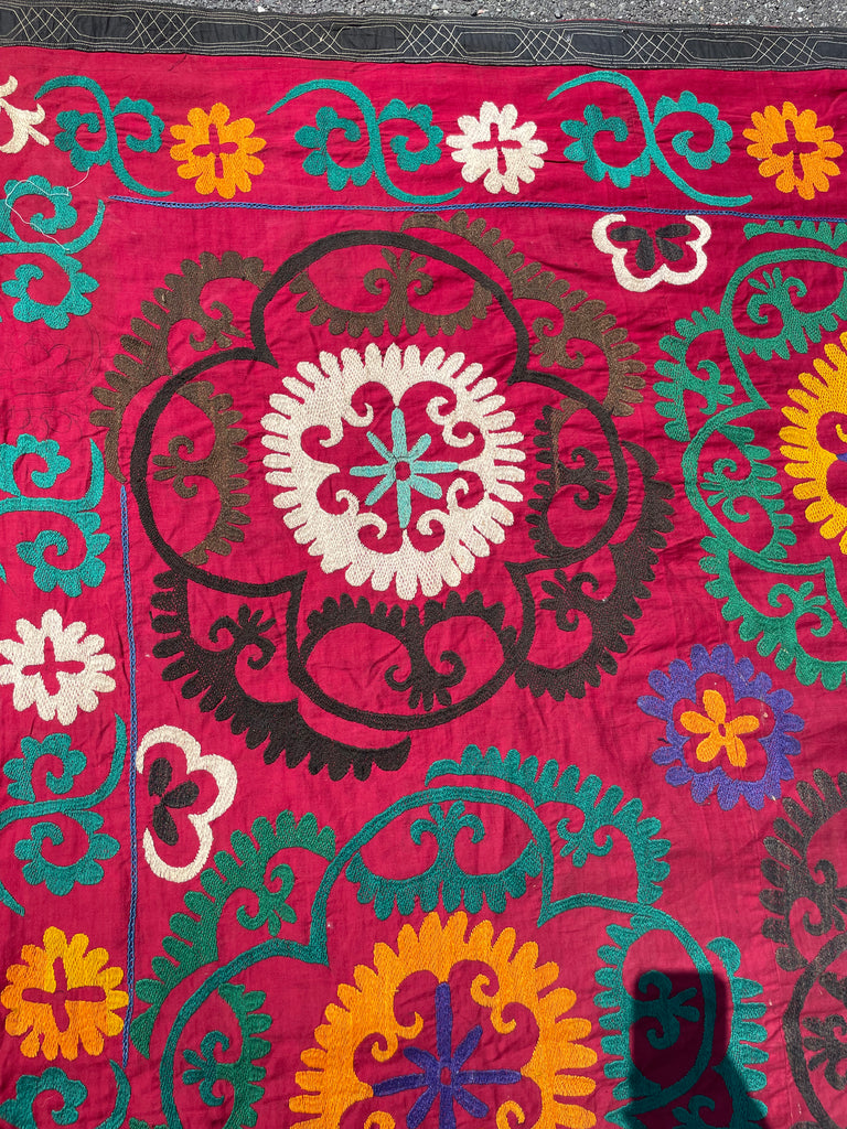 Old handmade uzbek wall hanging. This piece is a relic that was bought in Istanbul Turkey. Its an old handmade blanket or wall hanging and it contains a lot of history. Every stitch is done by hand.The piece shows beautiful imperfections of handmade stitches see the pictures.
