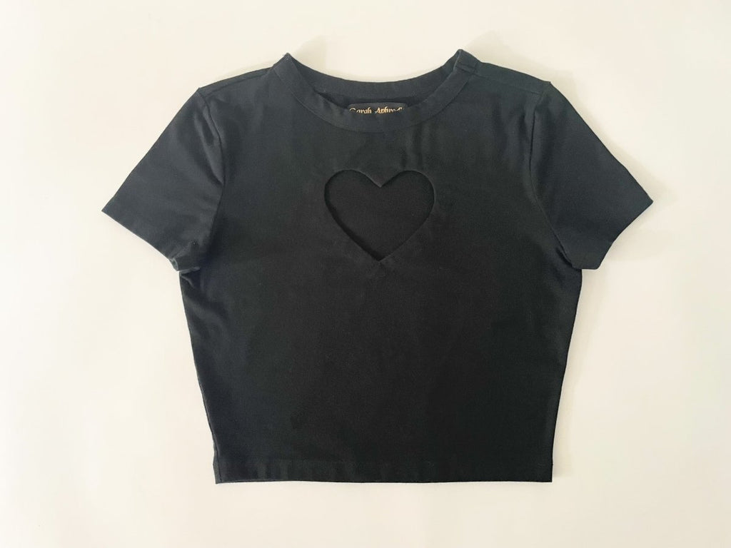 A handmade, one-of-a-kind sustainable black cropped heart cut-out top by Sarah Aphrodite, crafted from a carefully selected repurposed stretchy cotton-blend top. Designed to hug the body, it features a bold heart cut-out and a short, cropped silhouette that channels freedom, confidence, and eco-conscious fashion.