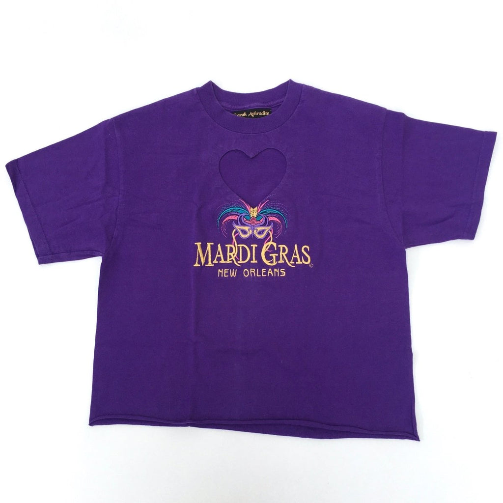 One of a kind handmade 'New Orleans Mardi Gras' tee with a heart cut-out. This tee is made from a carefully selected vintage cotton t-shirt. Note that the bottom of the shirt is raw and unfinished.
